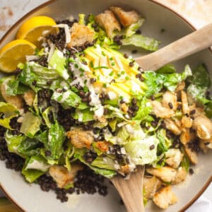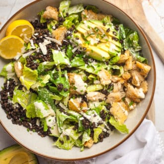 Fried black beluga lentils make a fantastic protein topping for a vegetarian Caesar salad! With pan fried croutons, avocado and crisp fresh Romaine lettuce, this is a hearty and filling salad with a delightful mix of textures.