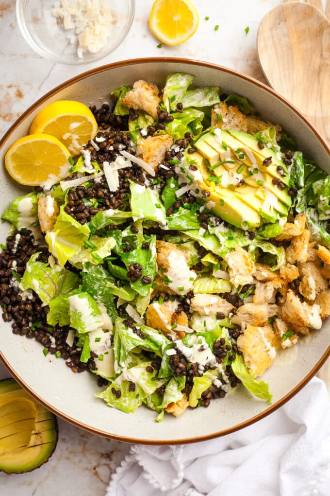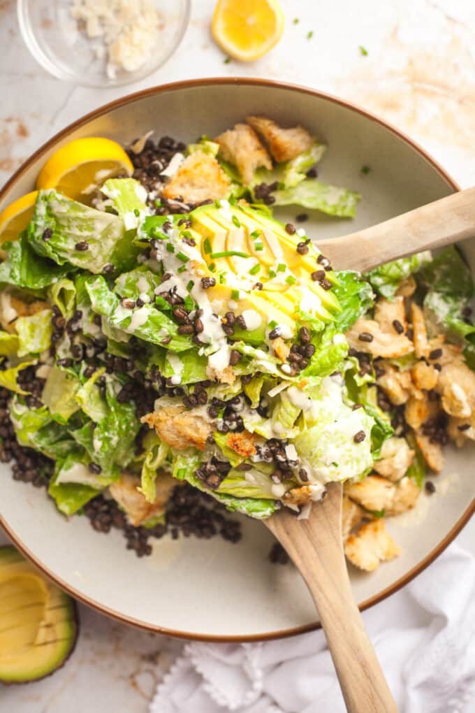 We are always on the hunt for unique spins on Caesar Salad around here, and this simple black lentil version was a fast favorite!