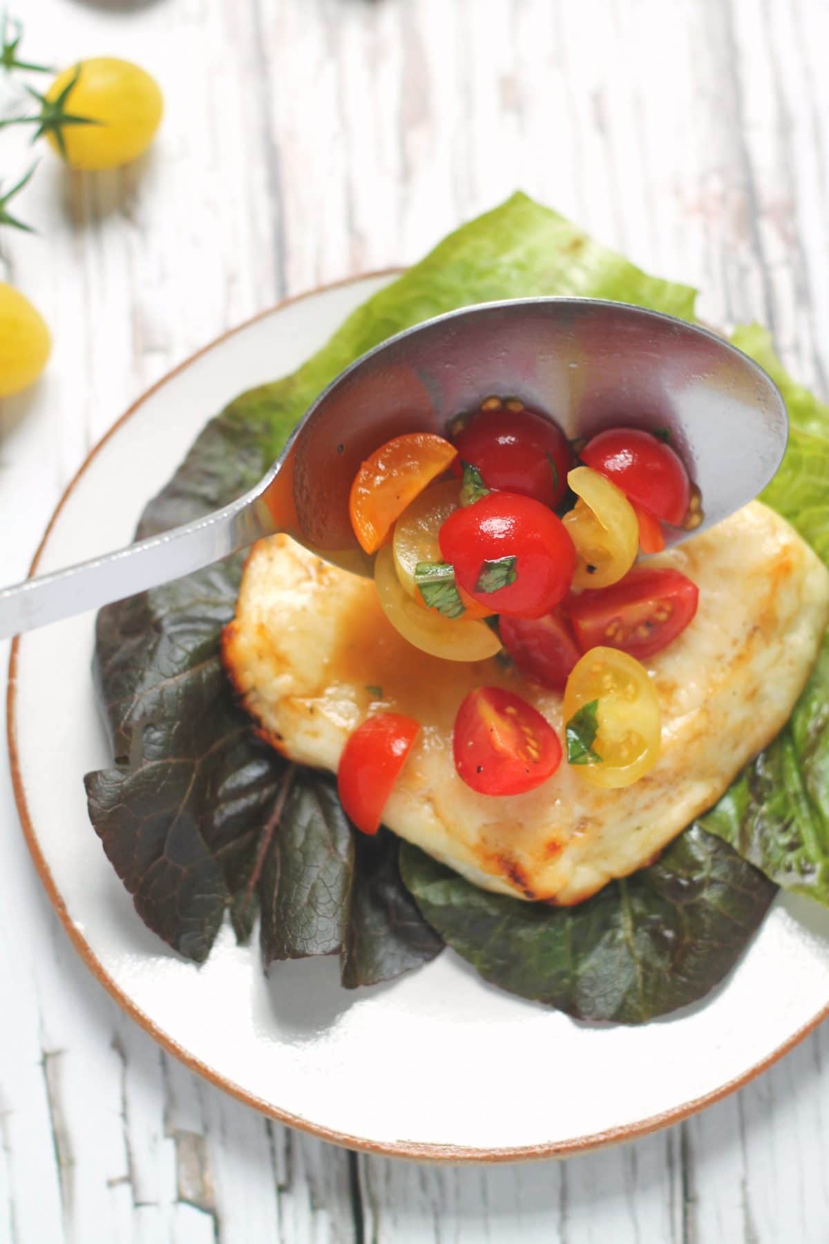 This dish was totally inspired by seeing pins on Pinterest for Bruschetta Chicken. I loved the concept, but wanted something to stand in for chicken that wasn’t fake meat. Enter halloumi cheese!