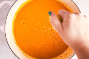 - Add the roasted butternut squash into the soup pot and give it all a good mix.