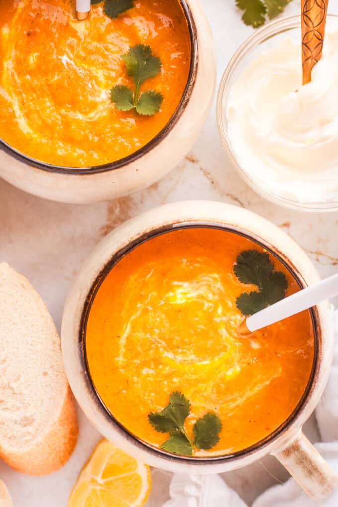 It is smooth, creamy, and absolutely packed with flavor. Sweet, with a little kick of spice, and some tang from a swirl of creme fraiche or sour cream.