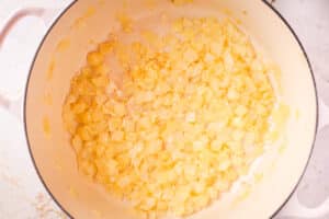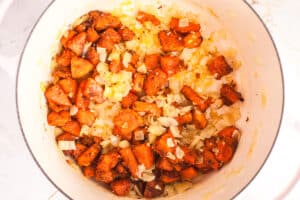 - Meanwhile, heat a little olive oil in your soup pot and saute the onions until soft and just starting to brown. Add the garlic and cook until fragrant, then remove from the heat and set aside.1 large onion, 5 cloves garlic