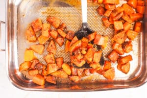 - Once your butternut squash cook time is up, check on it. Cook times can vary a lot depending on the size of your cubes, and the type of bakeware you use, but you will want them to be browned around the edges and soft in the middle. At this point, remove from the oven and drizzle with with honey, sprinkle the ras el hanout over the top, and mix to combine. Return to the oven for another 5 minutes, until the spices are fragrant.1.5 tbsp honey, 1.5 tbsp ras el hanout