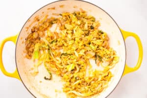 • For the next 25 minutes, saute the cabbage over a low-medium heat, stirring regularly, until it has significantly reduced down and is browning around the edges. If it sticks to the bottom at any point during this process, deglaze with a little splash of the white wine and lower the heat.