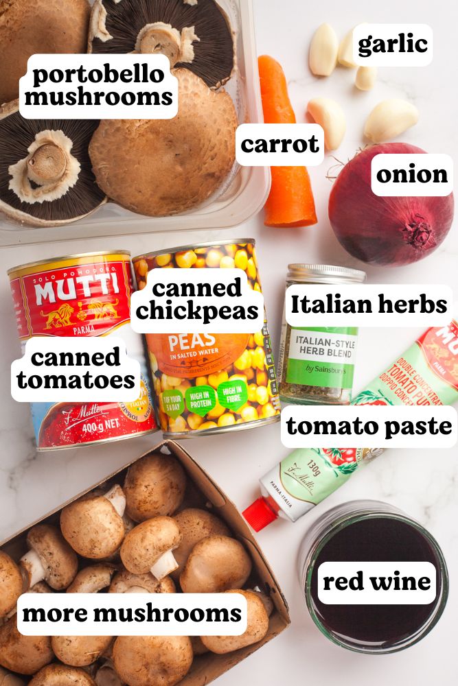 We roast a pan of mushrooms and chickpeas, then pulse them in a food processor so they resemble the texture of ground / minced meat, which is then fried with some vegetables and turned into a tasty, rich and nicely textured bolognese sauce.