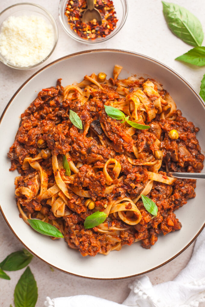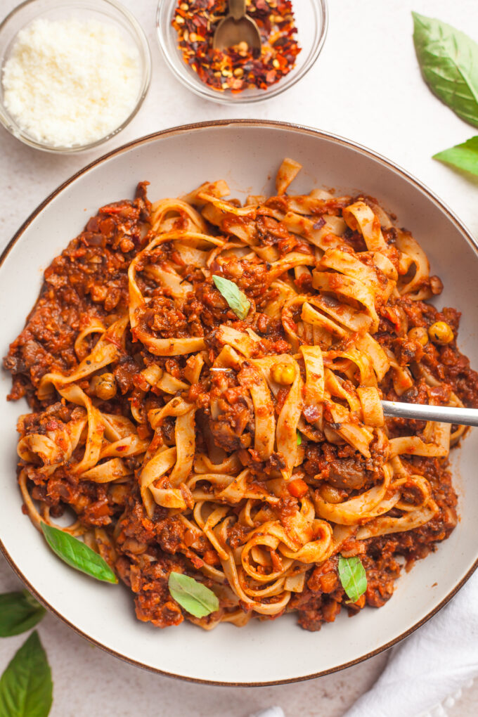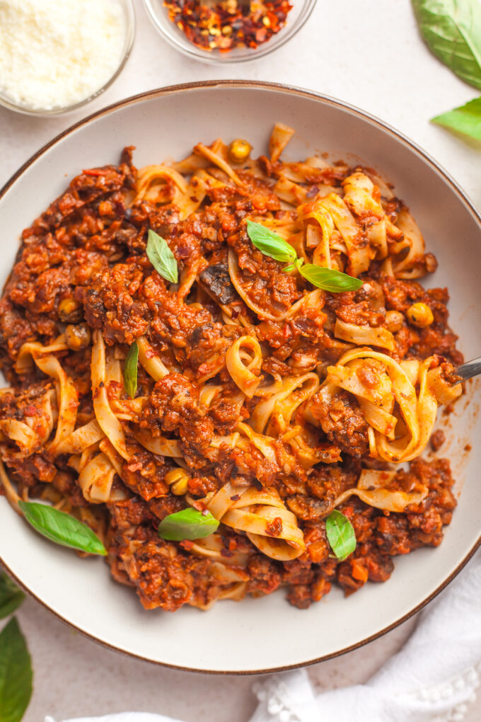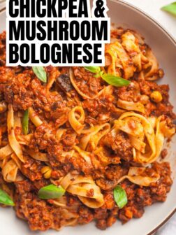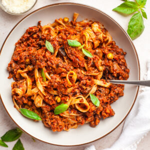 This is one of three bolognese recipes on my site, and I don’t play favorites, but this one is super special. It uses my signature homemade meatless “meat” and it’s like nothing you have tried before.