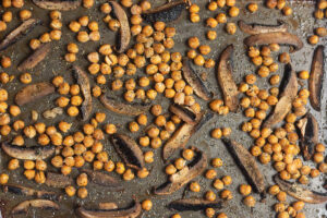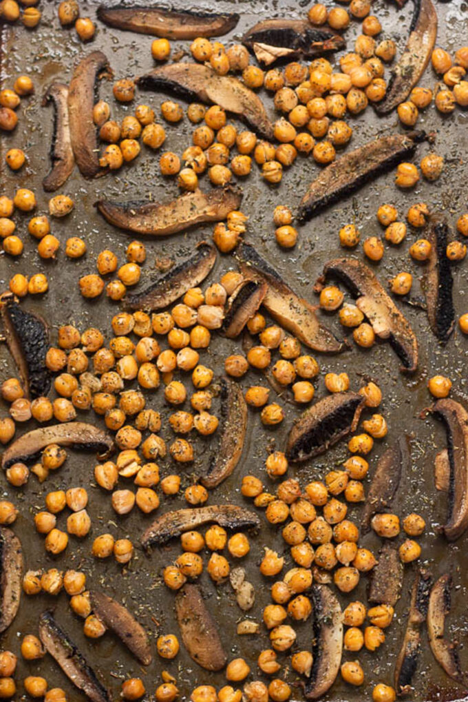 - The chickpeas and mushrooms are ready when the chickpeas are crisp and golden and the mushrooms are brown and have a robust "meaty" texture.Remove from the oven and set the pan aside, allowing the chickpeas and mushrooms a little time to cool while you start cooking the sauce.