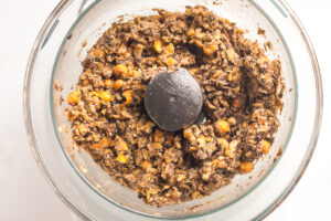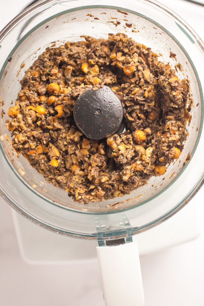 - The roasted chickpeas and mushrooms will have cooled down by now. Add them to a food processor or mini chopper and pulse until the mushrooms are finely minced. Some of the chickpeas will be broken down but some may still be whole and that is fine.