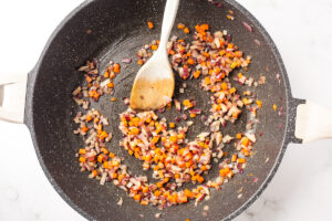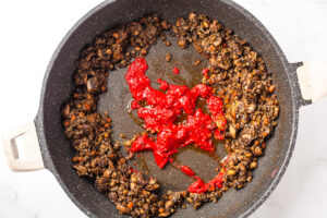 - Mix the tomato paste in with the rest of the pan and continue to fry all of the ingredients until the bright red color of the tomato paste has darkened a little.