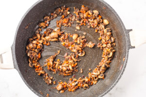 - Add the chopped mushrooms and garlic. Cook until the mushrooms are reduced and all of the liquid has left the pan. Remove from the heat while you get back to the chickpea and mushroom "meat".250 g additional mushrooms (any kind), 5 cloves garlic