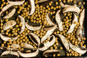 - Toss the drained chickpeas and sliced portobello mushrooms in a large bowl with the olive oil, Italian herbs and lots of salt and pepper. Scatter on a baking tray and place in the oven for 20 minutes.400 g canned chickpeas, 250 g portobello mushrooms, 1 Tbsp mixed Italian herbs, 4 Tbsp olive oil, salt and pepper