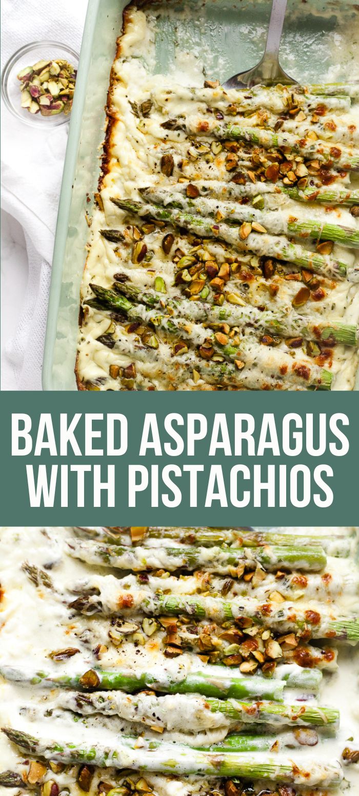 We’re pulling out all the stops for this asparagus, baking it in a rich creamy cheese sauce with garlic and tarragon, then topping with toasted pistachios and truffle oil. Baked asparagus has a beautifully tender, melt in the mouth texture and we are layering some amazing flavors on top to make it soar.