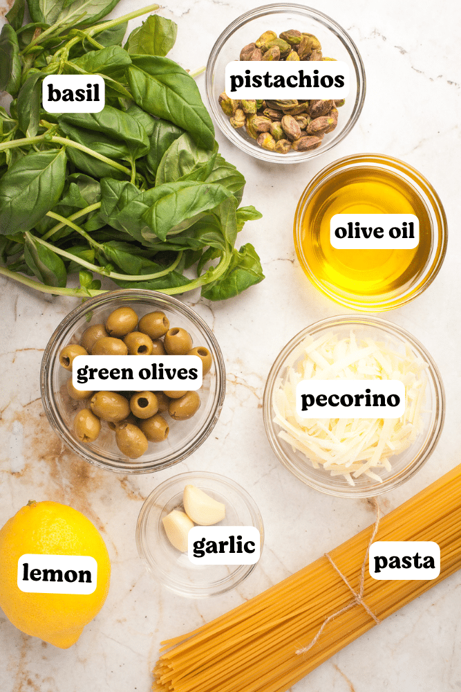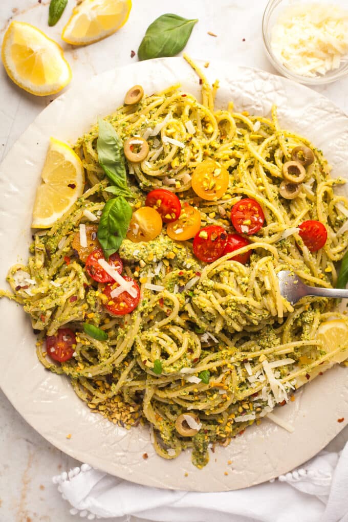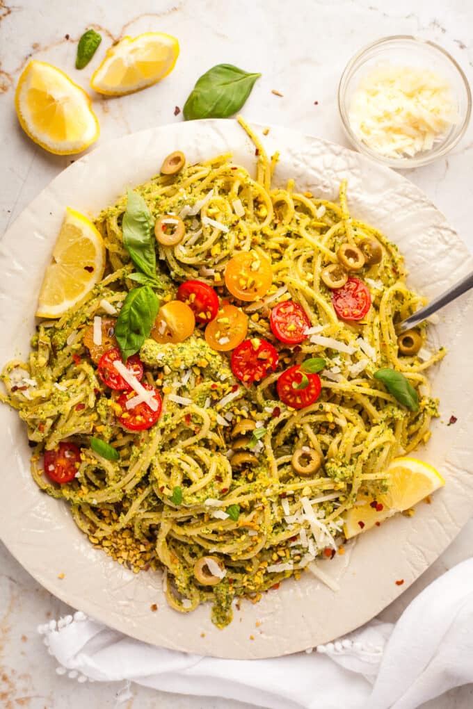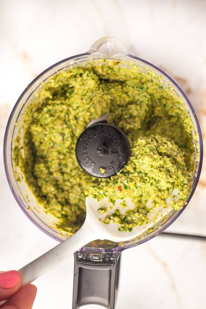 • Pistachios could be swapped for pine nuts or almonds but I do love their rich flavor and how they add another dimension to the color green in this pesto.