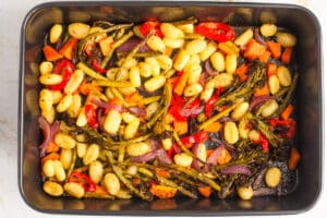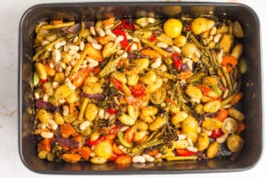 - I personally don’t roast the cherry tomatoes with the other veggies – I add them in raw alongside the cheeses to avoid them leaching liquid during the roasting process.