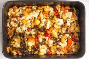 I use shelf stable dried potato gnocchi for this, which does not need to be pre-boiled. It goes in the pan from the beginning to roast alongside the veggies.