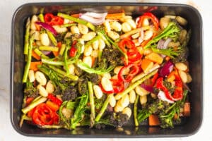 - I recommend using a metal pan if possible, because it conducts heat more quickly and will give the veggies a crisper roast. If you need to use glass or ceramic, that is OK – just note that glass and ceramic conduct heat more slowly, so you may therefore need a slightly longer oven time than the recipe states.