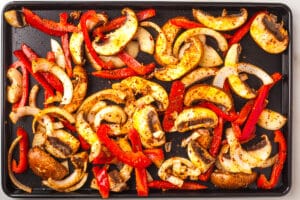 - We will start with the mushrooms, peppers and onions…Add the sliced mushrooms, peppers and onions to a large mixing bowl. Add 4 tablespoons of the olive oil and 2 tablespoons of the fajita seasoning. Mix to combine and ensure all of the veggies are well coated, then scatter on a half sheet pan or your largest baking tray. Place in the oven for 10 minutes.2 large portobello mushrooms, 1 medium onion, 2 tbsp fajita seasoning, 1 large red bell pepper