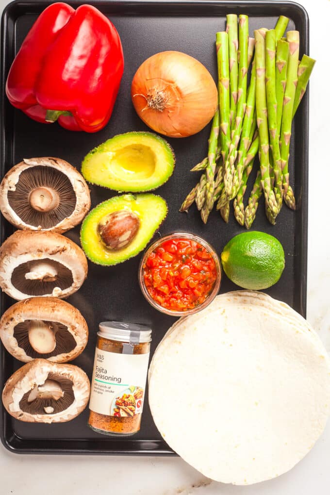 So we have our usual trio of fajita veggies here: peppers, onions and portobello mushrooms. But adding asparagus was just the thing we needed to make the dish more interesting. Asparagus is the perfect shape to be sliced into strips, it roasts up well and doesn’t leach any liquid into the pan (crucial for making sure we get a good crisp on all the veggies), so it’s just slotting in perfectly here. The mushrooms provide some “meatiness” while the peppers and asparagus just melt in the mouth. Perfection.