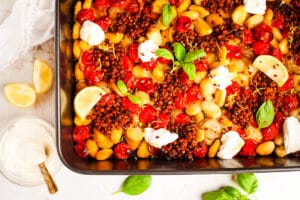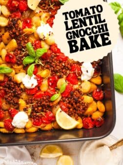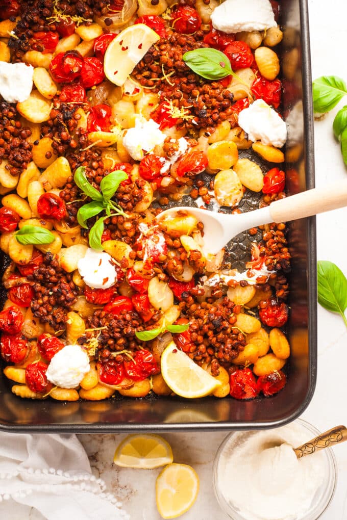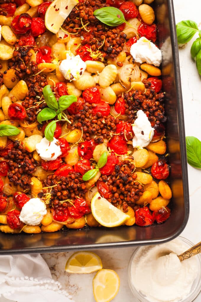 This vegetarian sheet pan gnocchi recipe is an easy dump and bake dinner with a delicious range of flavor and texture. Crispy potato gnocchi, melt in the mouth roasted tomatoes, spiced lentils, and creamy ricotta all come together to make a flavorful gnocchi bake that is weeknight friendly.