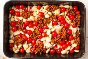 Honestly the hardest part about preparing this recipe is just gathering the spices and flavorings to mix in with the lentils. Otherwise it’s a breeze! A true “dump and bake” recipe – once it’s prepped, you just throw it in the oven and everything cooks to the same timeline.