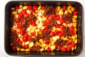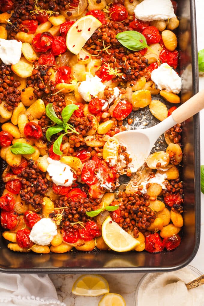 • Bake for 25-30 minutes, or until the gnocchi and lentils are starting to crisp up and the tomatoes are soft and melty.