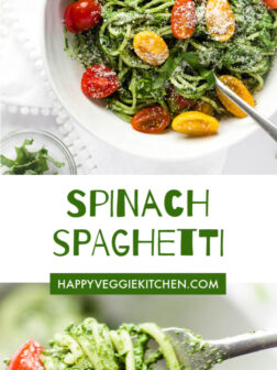 An easy, creamy spinach spaghetti sauce that comes together while the pasta is cooking! Silky smooth with the richness of parmesan and the freshness of basil and lemon, this sauce packs in a huge dose of healthy greens. Mix with cherry tomatoes for the perfect contrasting sweetness.