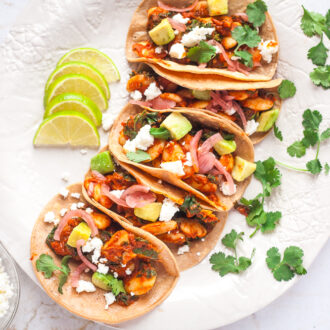 These tasty vegetarian tinga tacos use creamy large butter beans instead of meat! While nontraditional, Mexican style butter beans are amazing – the creaminess of the beans balances out the smoky spicy tinga sauce perfectly. You will love this quick, easy and unique vegetarian taco recipe.