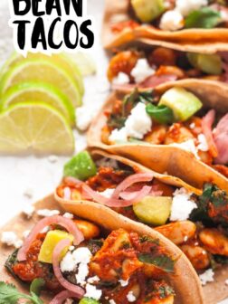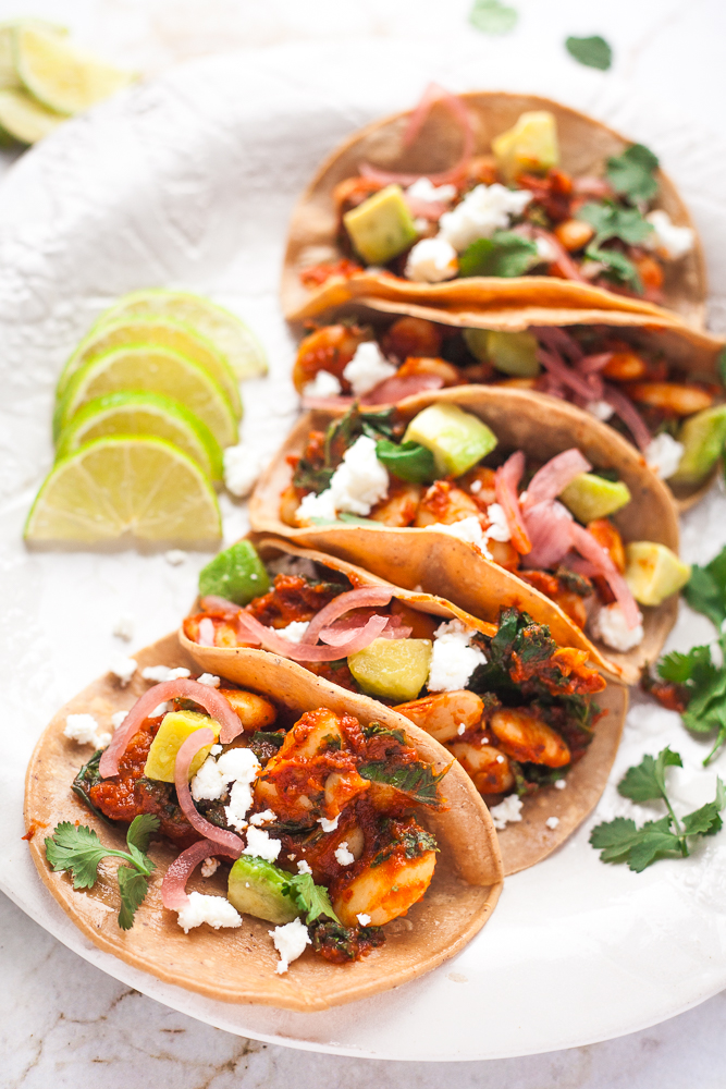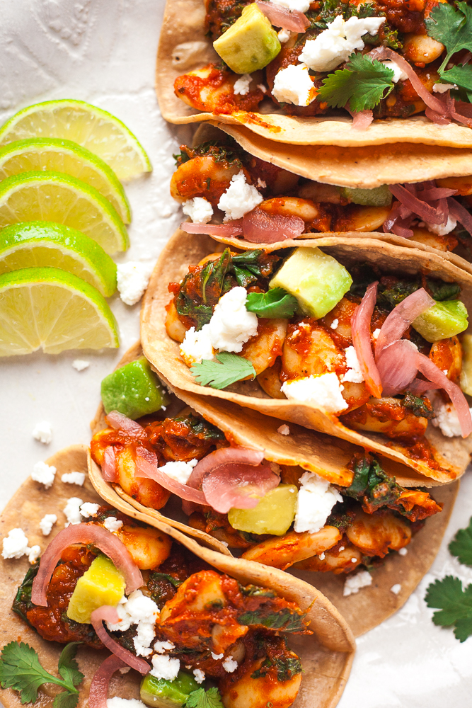 When we have a deep, smoky and savory filling like this one, I feel it makes sense to focus on cooling and fresh flavors. This is why onion (pickled or raw) and lime are top of my list. We also want to make sure our tacos aren’t too dry (always a risk with beans even when they’re swimming in a rich sauce like this one) which is where cheese, avocado or sour cream / crema can play a role.
