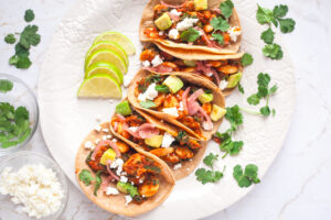 These tasty vegetarian tinga tacos use creamy large butter beans instead of meat! While nontraditional, Mexican style butter beans are amazing – the creaminess of the beans balances out the smoky spicy tinga sauce perfectly. You will love this quick, easy and unique vegetarian taco recipe.