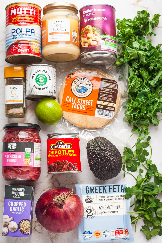 - Add the butter beans, and let it simmer over a low heat while you prep all of the toppings and warm your tortillas.Once you're ready to eat, stir the kale (if using) until just wilted.14 oz can of butter beans, 1 handful chopped kale