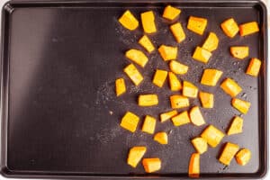 Give the sweet potatoes a head start in the oven. Add the sweet potato cubes to a mixing bowl. Drizzle in oil (use just enough to coat the cubes) and toss to combine. Add salt and pepper to taste. Scatter on one end of a baking tray and place in oven for 10 minutes.