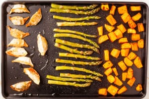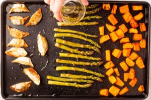 Now add the asparagus and gyoza. Remove the baking tray from the oven and flip over the sweet potato. Toss the asparagus stems in olive oil in the same mixing bowl you used for the sweet potato, then add them to the tray next to the sweet potato. Then toss the frozen gyoza in oil, and add them to the other end of the baking tray. You may need to push the sweet potato cubes over a little to create space, but it should all fit nicely with a bit of space around each ingredient. If it doesn't, move one of the ingredients to a different baking tray.Place back in the oven for 15-20 minutes more, until you have slightly crisp gyoza, tender asparagus and sweet potato that is browned on the edges.