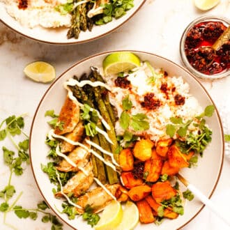 Assemble your bowls. Add half of the rice, sweet potato, asparagus and gyoza to each bowl. Scatter chopped cilantro (coriander) over the top, then drizzle with chili crunch and kewpie mayonnaise.