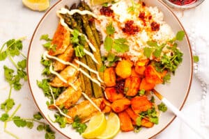 This gyoza / potsticker rice bowl recipe comes together in just over 30 minutes! Loaded with crispy oven roasted dumplings, sweet potatoes and tender asparagus with sticky rice and a variety of fun toppings. Minimal effort but maximum flavor, this is the perfect vegetarian bowl recipe for Meatless Monday.