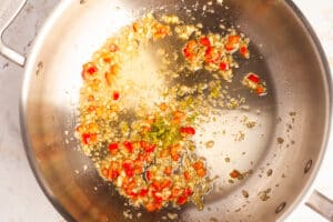 In a large saute pan or skillet, heat four tablespoons of olive oil over a low heat. Saute the garlic and chili until soft and fragrant then immediately remove from the heat. If it looks like the garlic might be close to browning, turn off the heat immediately, then add in a splash of the pasta's cooking water.