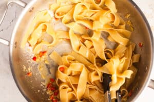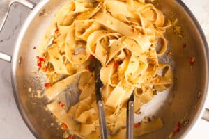 When the pasta is cooked to al dente, scoop out a cup of the cooking water and then drain. Add the pasta and lime juice to the saute pan with the garlic and chili. Use tongs or two wooden spoons to toss the pasta through the pan. Slowly add in splashes of the reserved cooking water, tossing continuously, just until the pasta is loose and glossy.