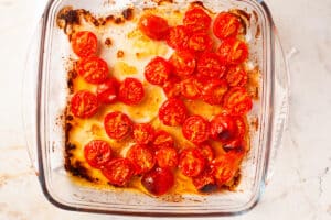 First, get the tomatoes roasting. Heat the oven to 390F / 200C / 180C Fan. Scatter them in a small baking dish or baking tray, drizzle with olive oil, add a little salt and pepper, and place in the oven for about 20 minutes until they are soft and jammy.Do this before you even start prepping the other ingredients because everything else can be done in the time that the tomatoes are in the oven.