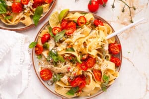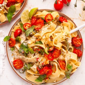 This simple pasta is a treat for anyone who loves pistachios! The bright flavors of lime and chili, the crunch of toasted pistachio, the sweet melty roasted tomatoes and tangy pecorino cheese come together effortlessly for a quick midweek meal. It's a versatile dish that can be paired with protein as part of a larger meal or just enjoyed on its own for a simple dinner.