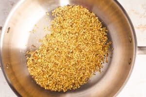 Toast the pistachios. Heat a cast iron or stainless steel pan to a low heat - don't add any oil. Add the pistachios and toast them (mixing regularly with a spatula) for a couple of minutes, until you can smell the toasted nutty scent. Then transfer them to a bowl and set aside.