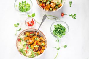 If you're making the coconut rice from scratch, start this once the paneer is in the oven. Just place all of the ingredients in a pan, bring to a boil and them simmer for 20-25 minutes until the rice is cooked through and the moisture is absorbed. Fluff with a fork and let it sit while you wait for the paneer to be ready.