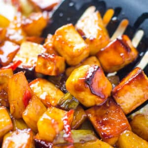 Once the paneer is ready, drizzle the toasted sesame oil and a little more teriyaki sauce into the pan and mix through with a spatula.
