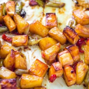 As easy and delicious vegetarian traybake / sheet pan meal with teriyaki paneer and caramelized pineapple. It comes together easily in one pan with very few ingredients, just put it in the oven and let the magic happen! Pair with coconut rice for an incredibly tasty fusion dinner.