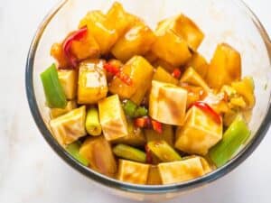 If you have not marinated your paneer - add the paneer, pineapple, sliced chili and the white bits of the green onion to a bowl. Toss with the teriyaki sauce.If you have marinated your paneer - take the bowl out of the fridge and add add the drained pineapple, sliced chili and the white bits of the green onion to the paneer and drizzle in another couple tablespoons of teriyaki sauce. Toss until everything is coated.